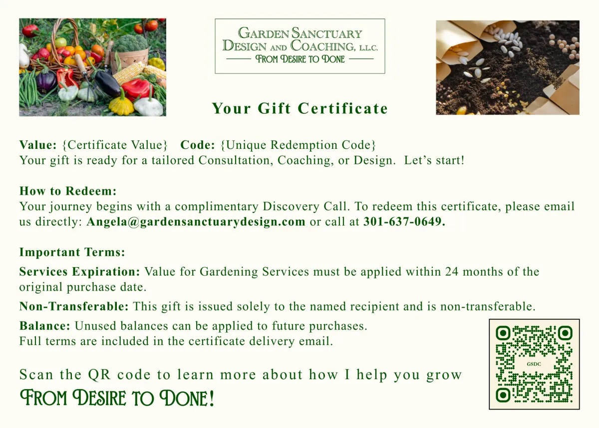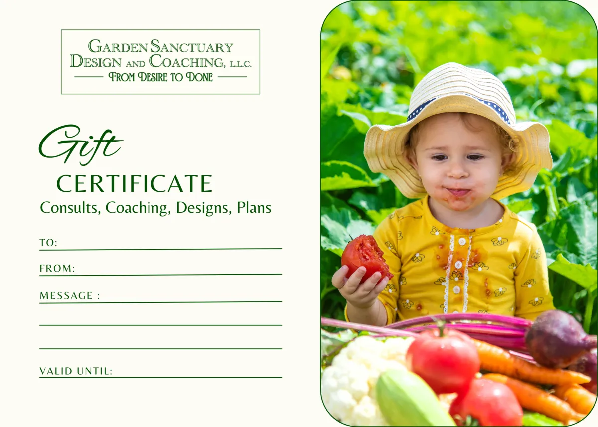 A Garden Sanctuary Design and Coaching gift certificate gives a loved one the chance to grow fresh, organic food with confidence and joy. It's a thoughtful way to support a healthier home, rooted in possibilities and wellness, and a garden that finally feels possible.